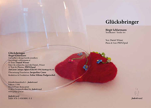 Als ob sich das Gatter zu einem verwunschenen Garten öffnen würde, so öffnet sich die Welt zu Birgit Schlarmanns Kleinoden. Eine Welt aus schillernden und prächtigen Schmuckstücken, tief verwurzelt in der Flora, mit strahlenden Farben und einer detailverliebten Vielfalt. Hier werden textile Sphären, wie die Filzarbeit und die Näharbeit, mit Garn und Perlen zu einzigartigen Körpern arrangiert. Es sind Collagen, die das klassische Motiv der Blume neu aufblühen lassen. Es sind Ringe, Ketten, Broschen, Anhänger, die durch ihr ordentliches Volumen und durch ihre haptische Großzügigkeit eine spürbare Kraft ausstrahlen. So ist eine Kette mit `Blumenast´ großzügig geschnitten. Sie zeigt eine aus kleinen Kugeln zusammen gebündelt faustgroße Blüte, die an einen festen Strang anschließen, von dem ein Blatt absteht. Dieser Ast mündet in einer Kette, die in ebenso breiten und runden Perlen aufgegliedert ist. Zusammen mit einem angenehmen Gewicht markiert der Ast das Zentrum des Körpers wie eine Energiequelle. Das Objekt wird zum floralen Glücksbringer. Gleich einem rituellen Werkzeug, liegen Birgit Schlarmanns Werke auch gut in der Hand. Tatsächlich können sie gedrückt oder gestreichelt werden oder man folgt mit den Fingern den gestickten Spuren. Einem Schmeichler ähnlich erscheint da eine handgroße Brosche, aus einer amorphen Form, einem gefundenen Stein gleich. Sie ist bestickt mit Blüten und Blattwerk mit unterschiedlichen Garnen. Der ´Blumenkorb´ ist gerahmt mit einem dünnen, aufgestickten Stoff, der zur Innenseite feine Raffungen aufweist. Sie erinnern zum einen an den Rahmen eines Genregemäldes und zum anderen an Bordüren oder sorgfältig gesetzte Falten von Polstermöbeln. Da wird in neuen floralen Interpretationen die eigene Heterogenität hinterfragt, ohne aber weh zu tun, sondern um zu versöhnen, um zu vereinen, um einen neuen Konsens zu suchen. Als ob das Filzpolster selbst zum Schmuckmöbel werde, verschmelzen hier die Grenzen zwischen Bild, Objekt und angewandter Kunst. Daher sind es Einzelstücke, die diesen Willen der Künstlerin besiegeln. Unikate, die einen anschmiegsamen und weich- nachgiebigen Raum, gleich einem Amulett bilden, in dem auf eine neue Art ein persönliches Geheimnis, ein Gedanke ruhen darf, wie jener an die Flora eines verwunschenen Gartens.